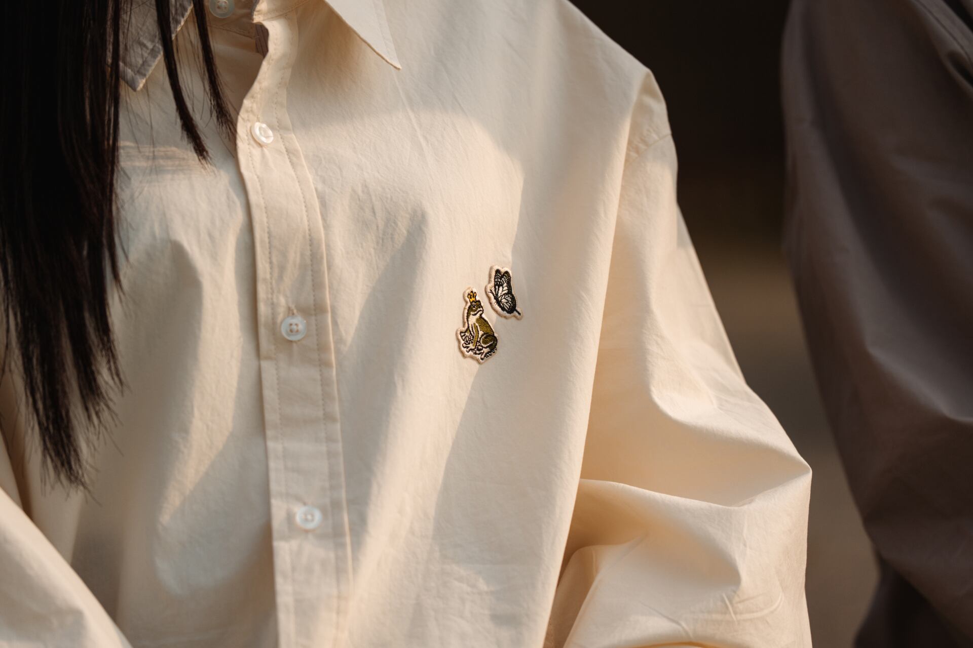 Gratitude1の象徴であるカエルと蝶の刺繍を施した一着